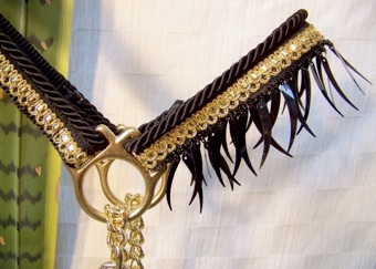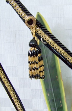 This unique & beautiful set features our exclusive shark tooth fringe on the nose and a beaded tassel. It is darkest black with metallic gold braid. Exquisite!