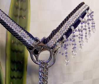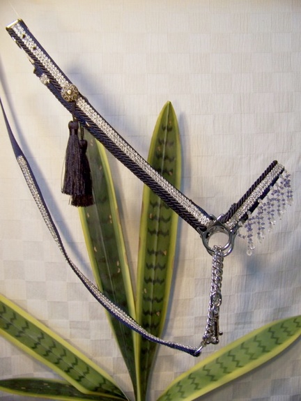 This is a gorgeous navy blue halter set with glittering silver metallic braid and incredible 2 inch silver and blue lattice beadwork fringe on the nose.